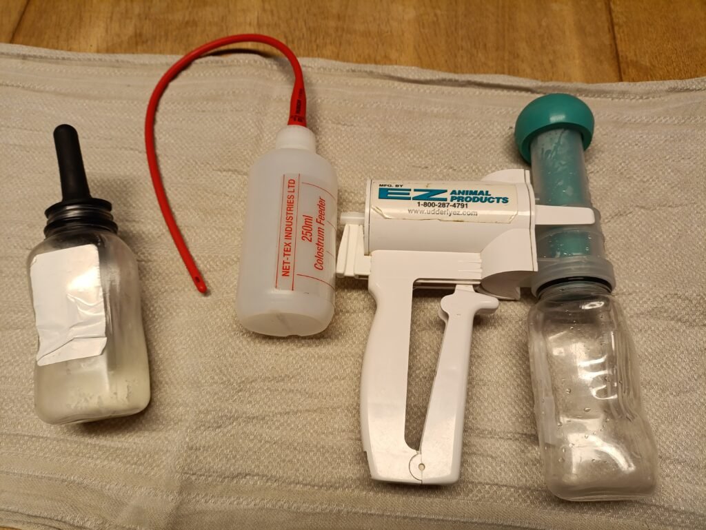 Doch selbst das Saugen war für das Kleine zu viel. Es fühlte sich bereits unterkühlt an. Daraufhin haben wir es mit ins Haus genommen und mit dem Fön warm geföhnt , während wir es weiter mit alten Handtüchern trocken gerieben haben. Zum Glück hatten wir eine Sonde von einer ehemaligen Schafhalterin geschenkt bekommen.